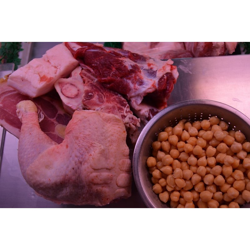 Preparado de cocido: compuesto por un trozo de morcillo de 250 grs, un trozo de falda de 250 grs una punta de jamón, hueso de espinazo salado, trozo de tocino, hueso fresco de ternera, cuarto de pollo.